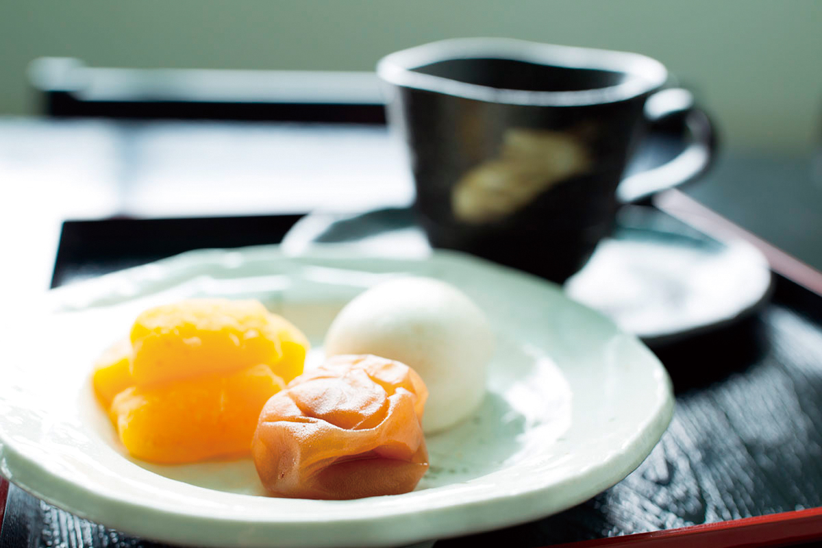 和歌山産のフルーツを使った和のわかやまポンチ。季節によって内容が変わる。 写真は南高梅のグラッセ、温州みかんのわらび餅、桃と梅の大福とコーヒーのセット。