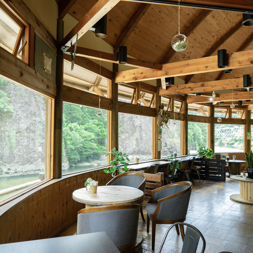特産品の柚子やジビエなどがあり、店内の飲食スペースでランチやカフェができます。また、キャンプ場も併設しているため、キャンプ用の薪や食べ物も販売しています。